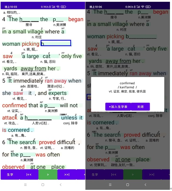 对于听听忆音来说,听单词页,重复循环朗读单词。单词的重复次数,以整编文章的配置为准。点击生字两字,可以配置聆听次数。 加入生字表的单词,只显示首字母,目的是记忆单词发音的时候,回想单词发音的时候,不能更加文字想发音,正确的根据发音想文字。这个顺序相反,学英语会越来越困难。 点击对应的单词可以加入生字表,或者移除之。移除生字后在首页的后台,及本页不在播放。 应该少听单词,而通过听短语和句子来记忆单词的发音。单词在句子中的发音,会有根据意思而变化的。